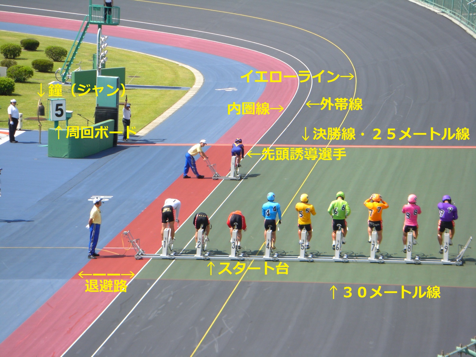 競輪で当てるためにはコツが必要です。 「前に競輪に挑戦したことがあるけど、全く当たらなかった」なんて人もいるんじゃないでしょうか? 当たらない原因として考えられるのは ・ラインなど競輪の基本情報を理解していない。競輪の最大の見どころでもあり、勝負を大きく左右するが "ライン" と呼ばれる選手同士の連携です。 自転車競技では70km/hものスピードでレースが行われるため、選手には物凄い空気抵抗がかかります。 そこで、選手達は隊列を組むことでレースを有利に進める工夫をします。 これが "ライン" の基本です。 先頭の選手は後ろの選手のために風避けとなり、後ろの類があります。「競輪予想イロハのイ」では,最もオーソドックスな周長である400mバンクの解説として 話を進めていくことにします。 コーナー名称& バンク周長 ① ② ③ ④ ⑤ ⑩ ⑦ ⑪ ⑥ ⑨ ⑧ ①スタートライン ②ゴールライン ③hs(ホームストレッチ)